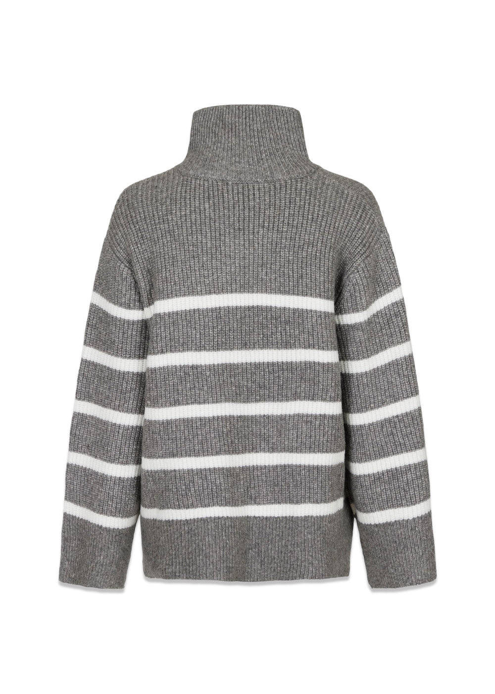 Nevena er en strik fra Neo Noir med lynlås foran og høj hals. Den har en løs pasform, brede ærmer og striber.
